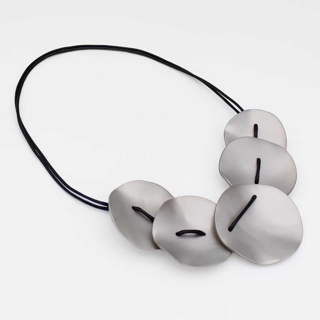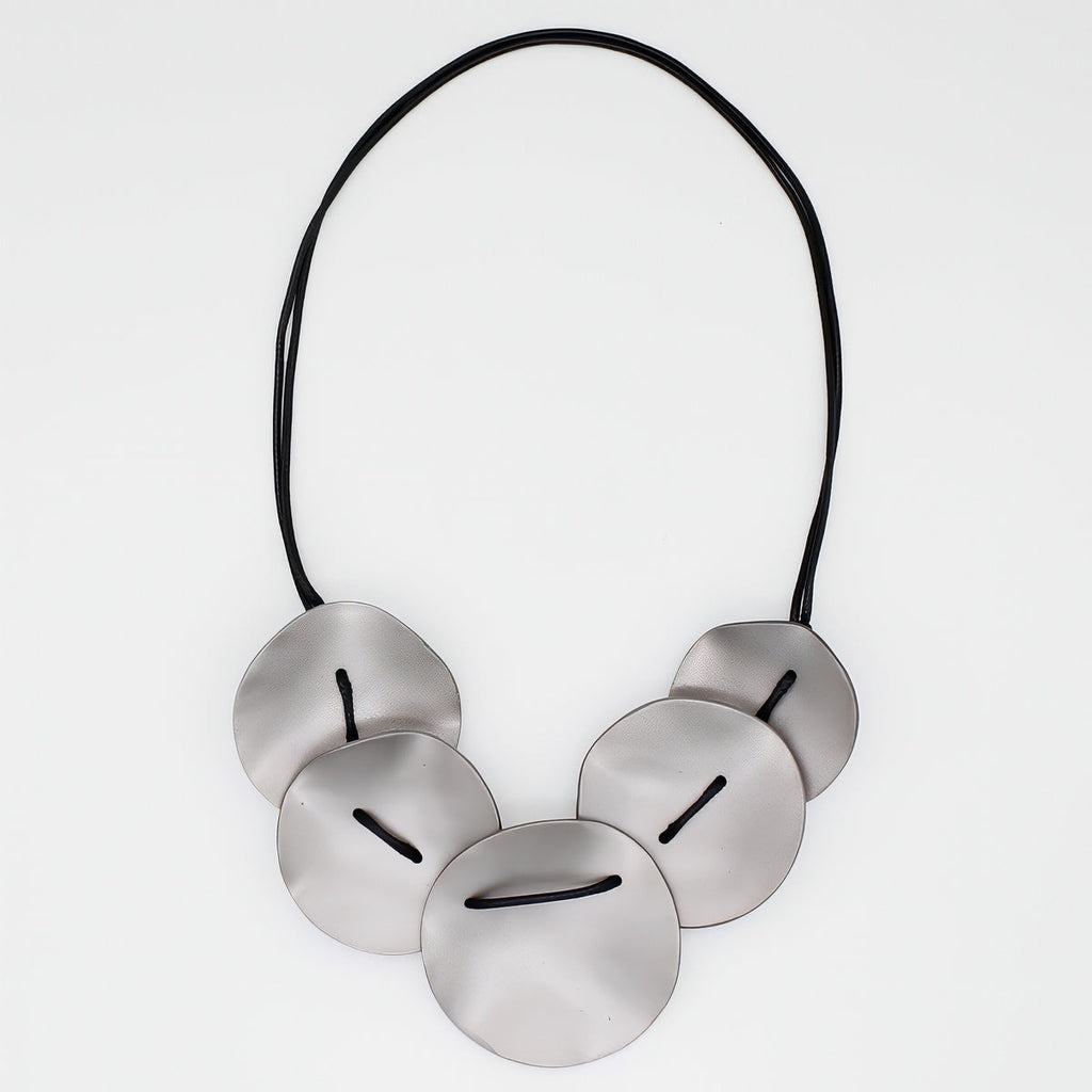 Graceful and enchanting, the Antique Silver Opaline Drift Statement Necklace is a stunning fusion of ethereal beauty and modern artistry. Featuring lustrous silver pearl-like resin beads that are strung on an adjustable black wax cord. Lightweight yet bold, this necklace is perfect for those who love timeless sophistication with a contemporary twist. Elevate any ensemble with the Opaline Drift, a true embodiment of luminous elegance and artistic expression.