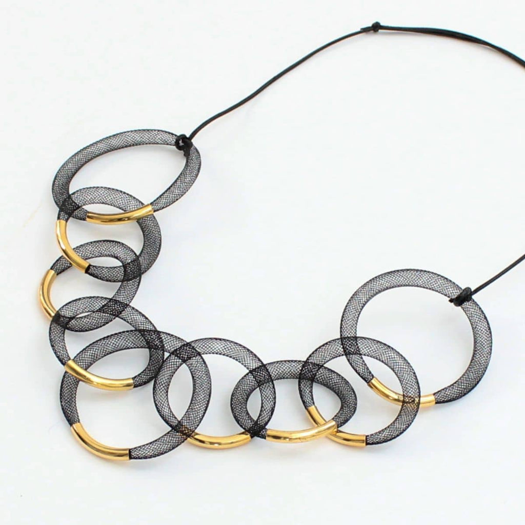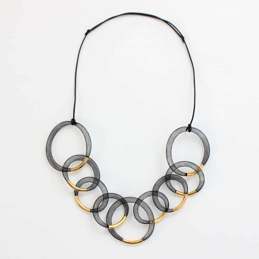 It doesn't get any more light weight than this... large and small black mesh loops come together to create this statement necklace. Each mesh loop is accent with a gold metal bar bead. The necklace hangs on an adjustable black wax cord so you can wear it at the length you prefer! Wear this with a flowy dress for a fancy night out! Wear it alone, or with the coordinating earrings!Adjustable Length 22"-26"