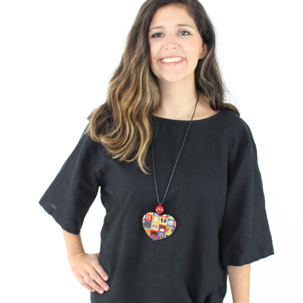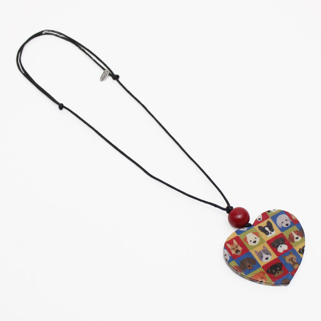 A must have pendant for the animal lover! The decoupage wrapped heart shaped wooden pendant features a fun colorful dog design. The pendant is accentuated with a round red wooden bead and hung on an adjustable black wax cord. Pair this pendant with a casual tee and jeans for a cute everyday look!