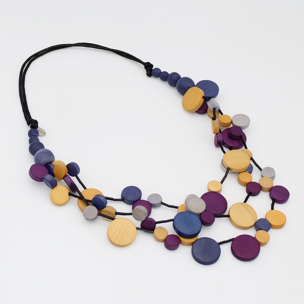 This triple strand, shades of purple and mustard necklace is made to go with everything! Flat round wood beads are hand painted in a variety of bold colors and layered together on multiple strands of black wax cord. The adjustable neckline lets you choose the length you prefer. For a more casual look, wear over a simple tee, or fancy up that little black dress for a night out.