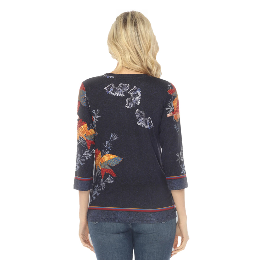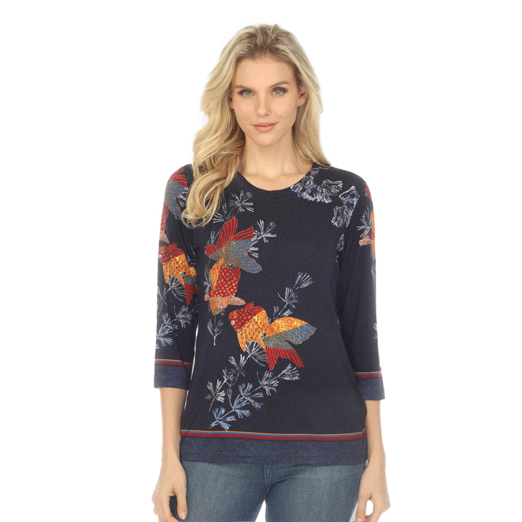 Citron Tee featuing vibrant gold fish against a deep blue background, coordinating border on the hem and sleeves