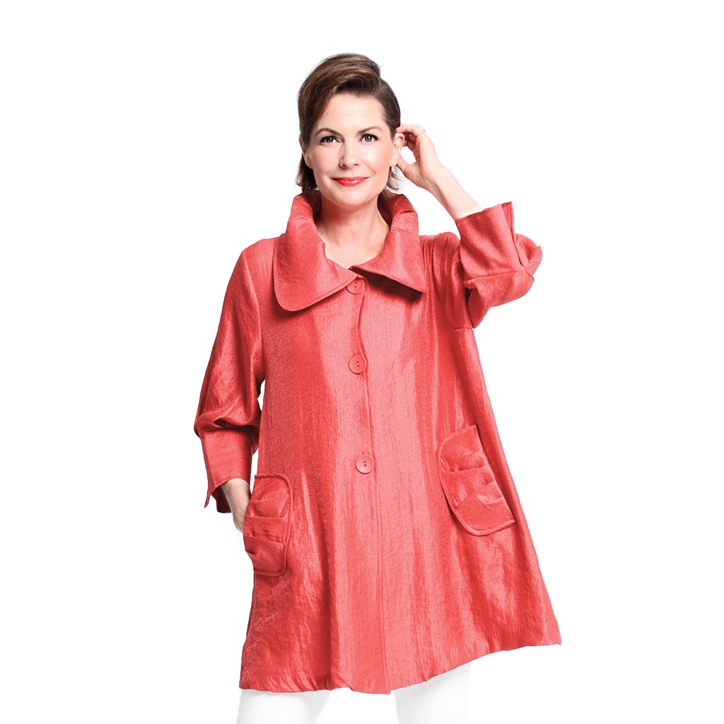 Solid Shimmery Button Down Swing Jacket in Coral Red - 200 -CRD