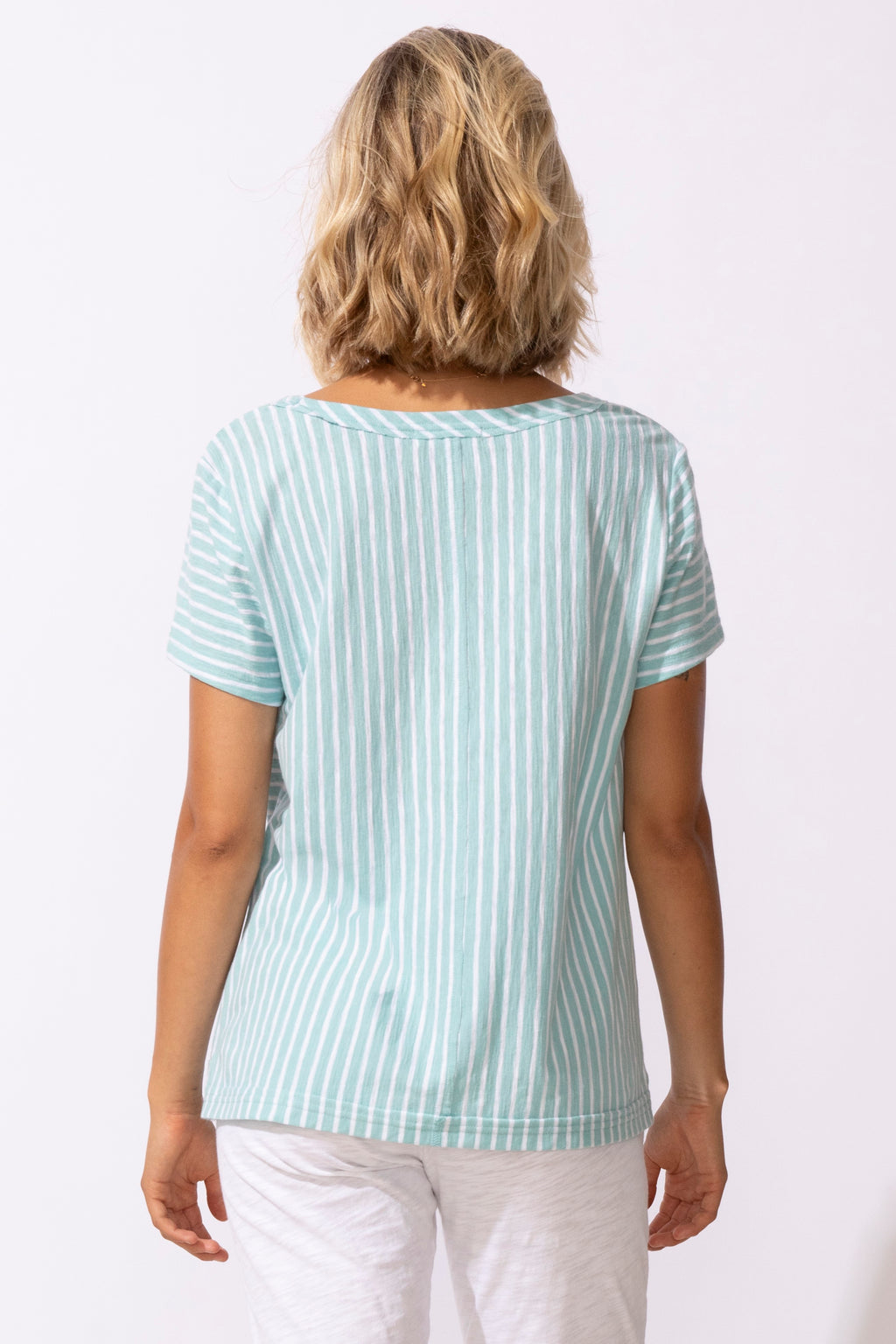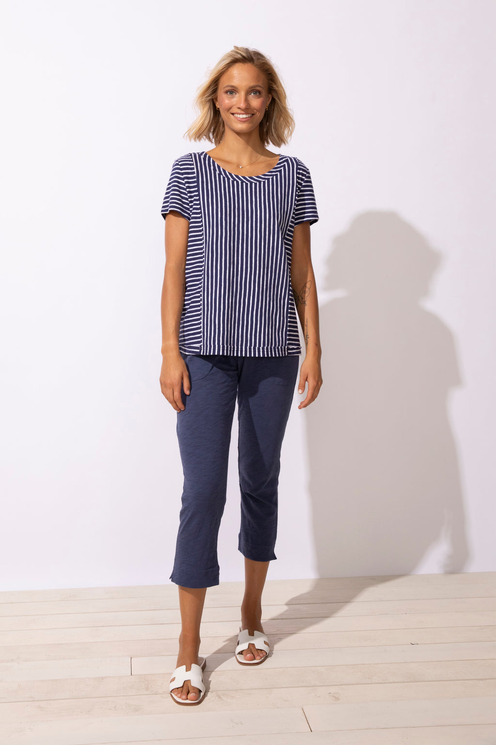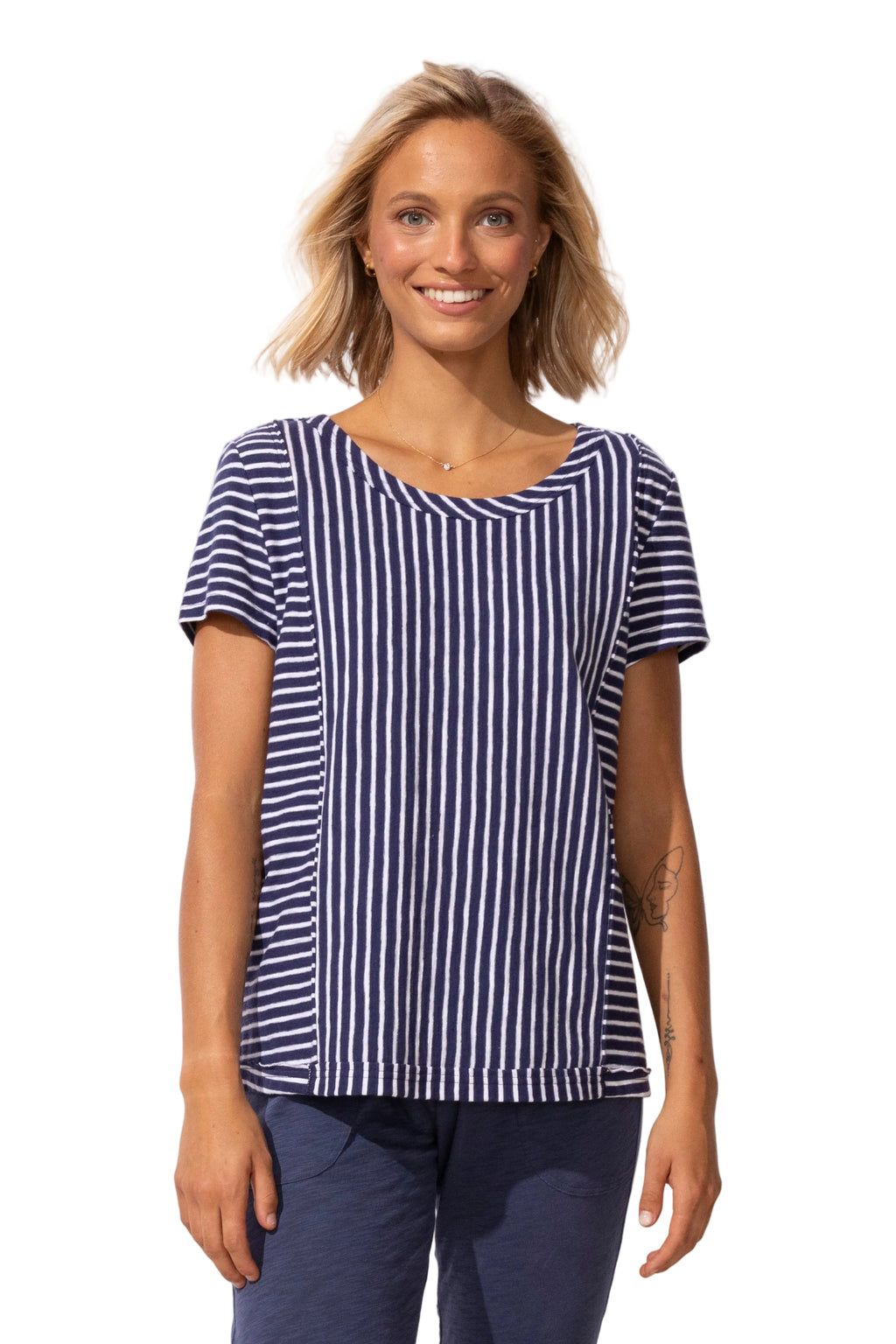 The San Barb Stripe Seamed Tee is an easygoing, everyday staple with thoughtful details that elevate its casual vibe. What really sets this tee apart is the seamed panel construction. Subtle seam lines add structure and visual interest, breaking up the stripes and giving the top a more tailored, intentional look than a standard striped tee. The slightly boxy, relaxed fit drapes effortlessly without clinging, making it breathable and easy to move in.