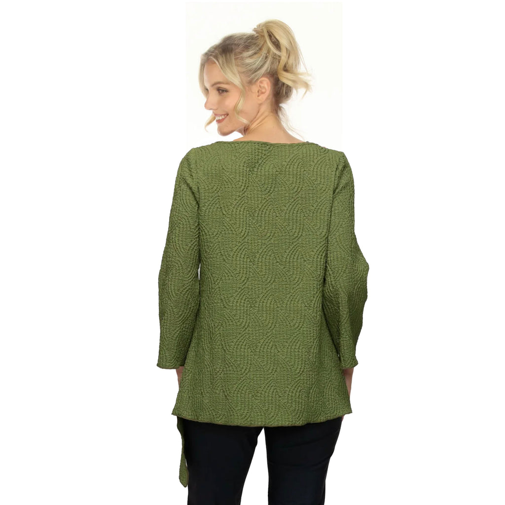 The jacquard knit adds dimension and depth, while the wide sleeves offer a graceful, flowing silhouette. Decorative black toggle accents at the side lend a stylish, contemporary touch. Perfect for both daytime sophistication and evening charm, this tunic pairs beautifully with tailored pants or slim leggings for a polished finish.