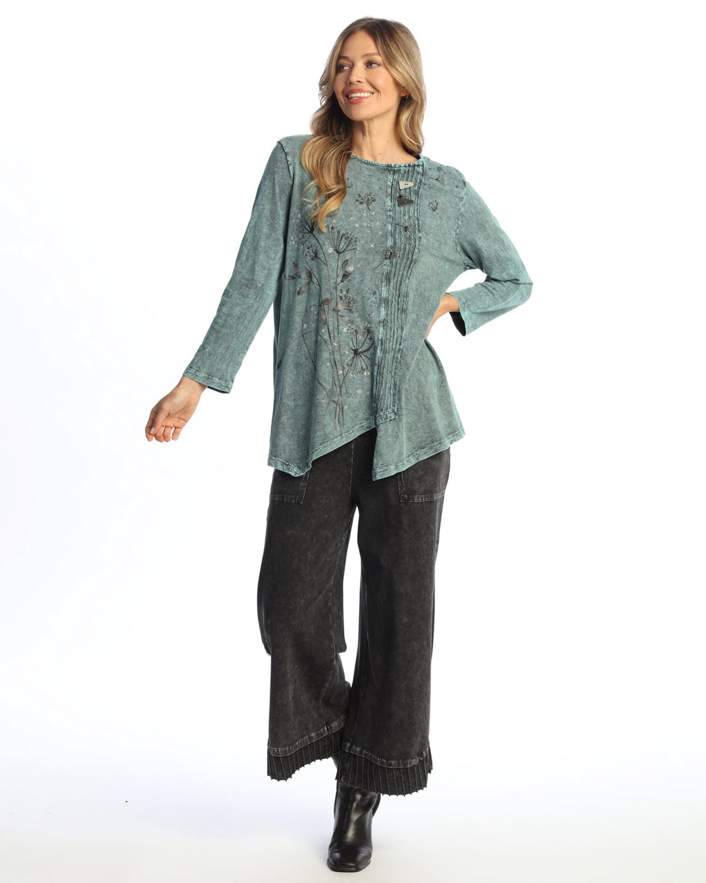 "Wish" Mineral Washed Faux Wrap with Wavy Contrast Tunic Top - M122-2166
