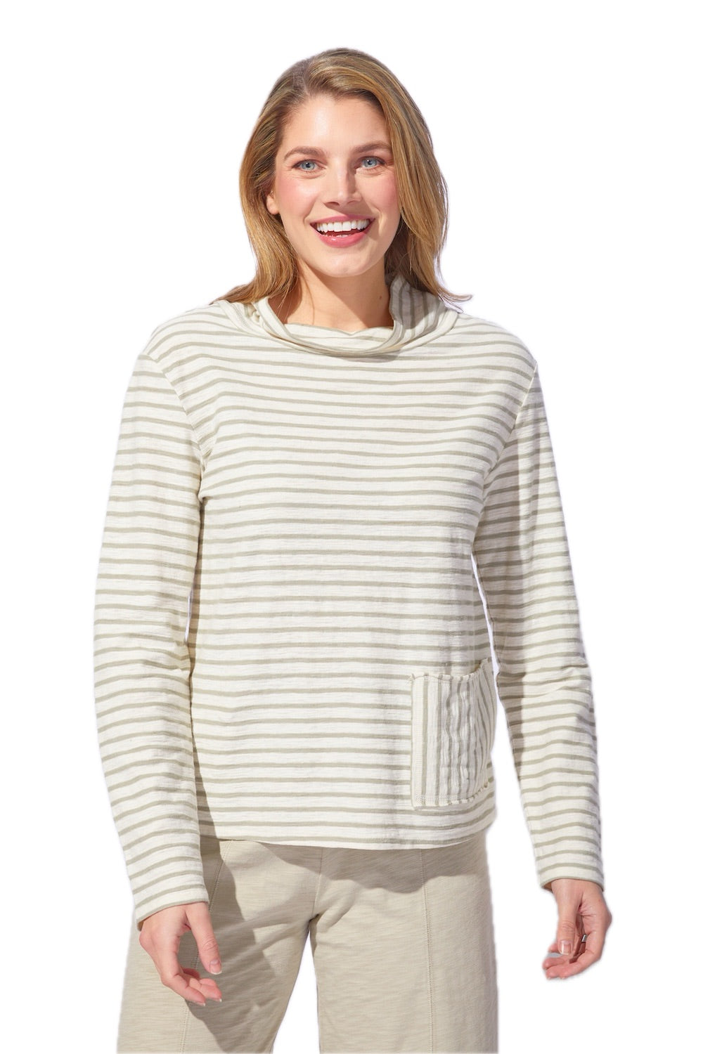 A textured cotton/linen blend brings nuance to our Santa Barbara Stripe. Rolled edge funnel neck, coverstitched front pocket, rolled sleeve and bottom hems. Great layering piece.