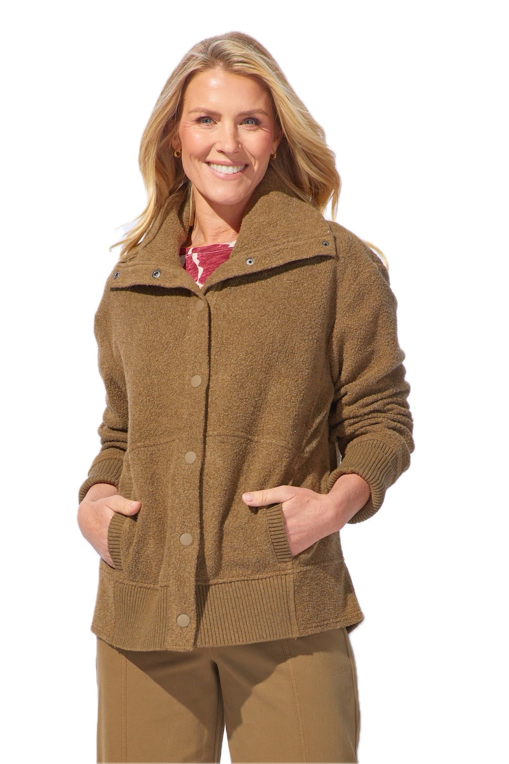 Cozy and modern heathered cotton rich fleece. Loads of texture, dyed to match rib trim cuffs and bottom hem. Snap front closure, built in pockets and oversized cozy up collar. Gear up or wind down in comfort.
