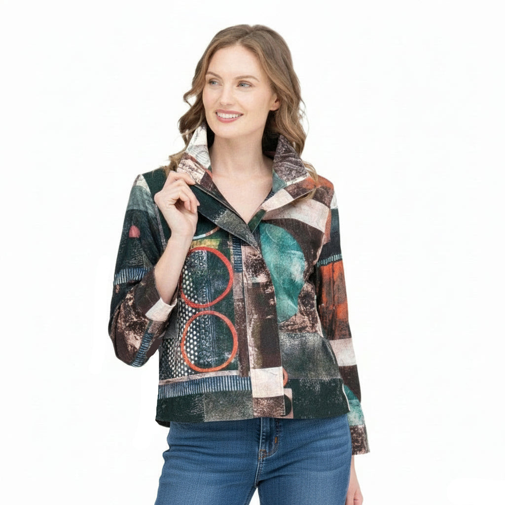 A striking statement jacket crafted in a soft micro-cord texture, featuring an artful mix of geometric and painterly patterns. Effortlessly chic and designed for everyday comfort.
