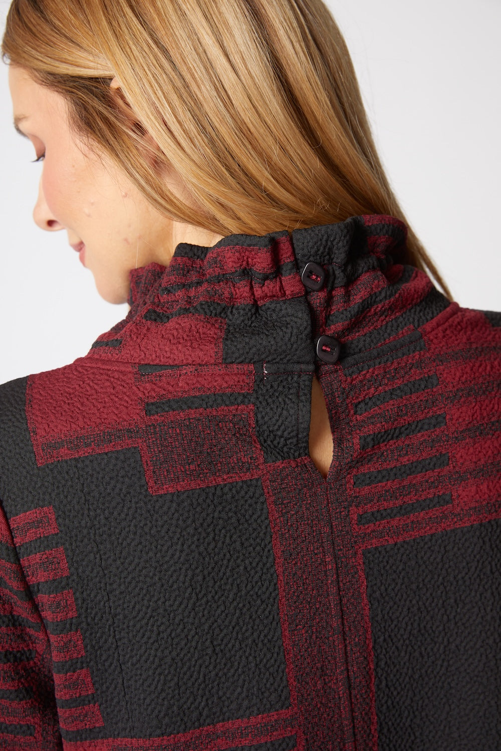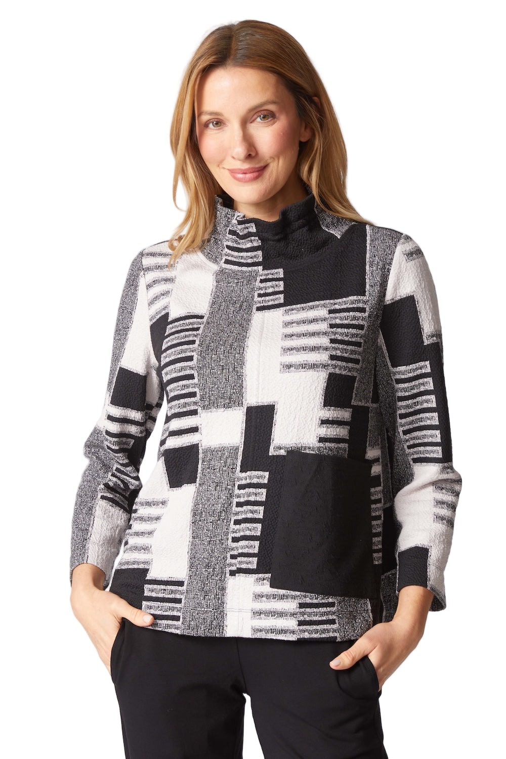 Mixed jacquard knit patterns combine for a modern vibe. Collar is ruched with a wire to hold its shape and bend to your liking. Oversized front pocket and bracelet length sleeves add a retro flair. Perfect paired with our Ponte bottoms.