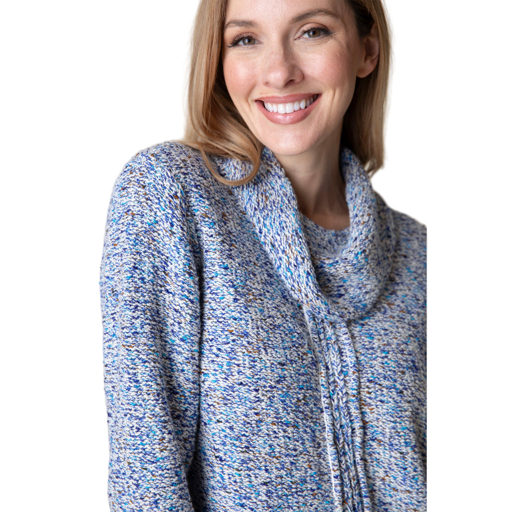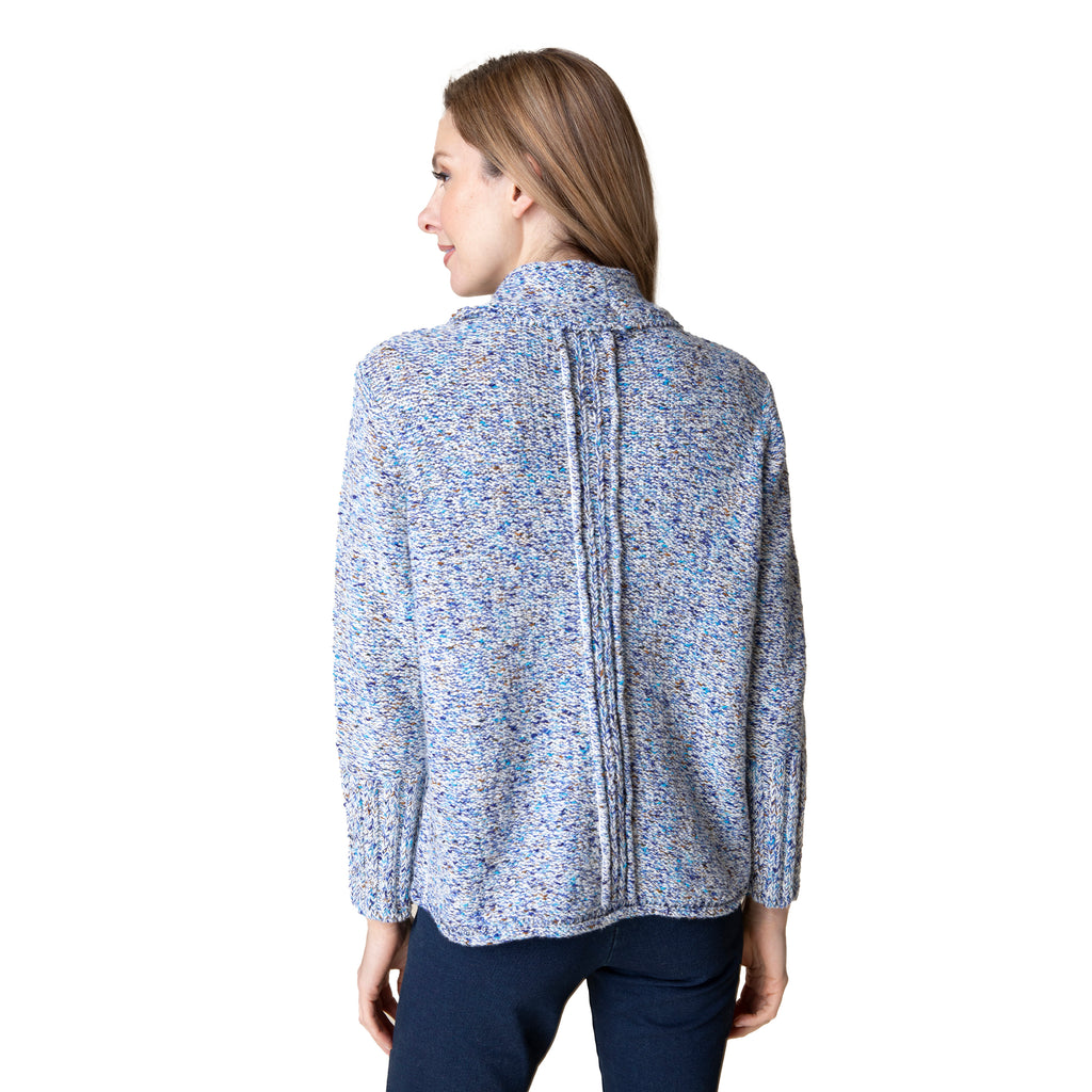 Beautiful speckle-dyed yarn with flecks of denim blue, sky blue, white, and soft tan.