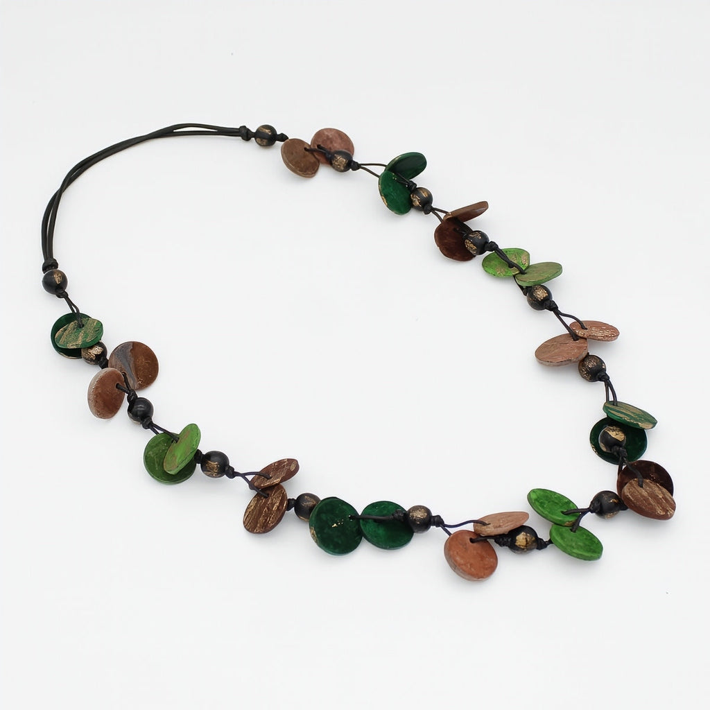 Naomi Verde Statement Necklace – A stunning fusion of earthy elegance and bold design. This handcrafted statement piece features hand-knotted wood and resin beads in rich verde greens and warm browns, finished with a brushed metallic accent that catches the light beautifully. The perfect blend of organic texture and modern sophistication.