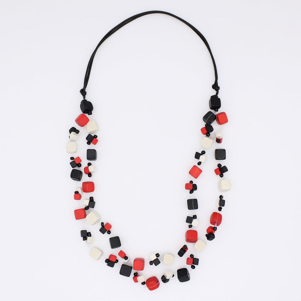 Introducing the Red and Black Lia Floating Bead Necklace. Made with small wood beads in red, black, and white; this necklace features a lightweight and adjustable cord, creating a multi-strand, floating invisible chain. Elevate your wardrobe with this elegant and exclusive double-strand piece.