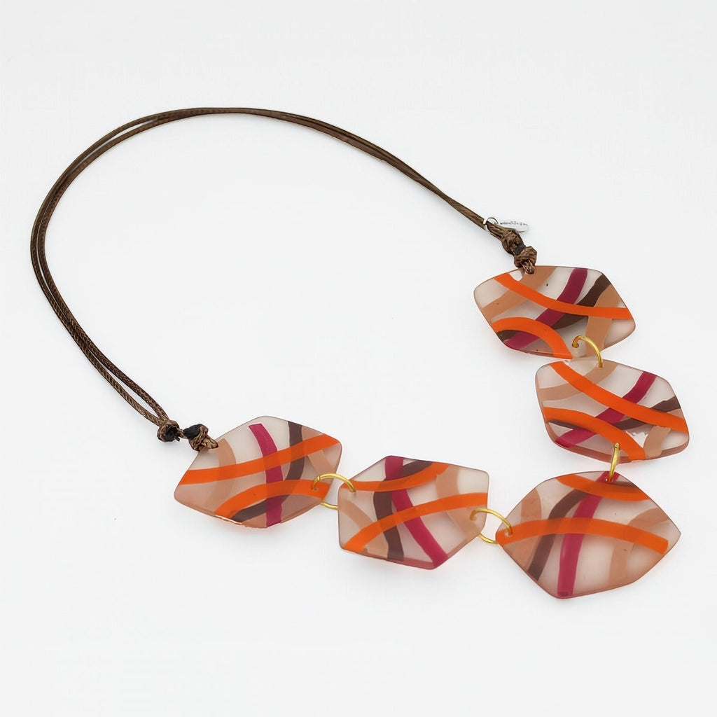 Sunset Glow Frosted Statement Necklace – Add a pop of playful color with this stunning frosted geometric resin necklace, featuring translucent shapes in vibrant orange and purple hues. The modern frosted finish gives it a smooth, matte look that catches the light beautifully, while the bold geometric design adds a touch of artistic flair to any outfit.