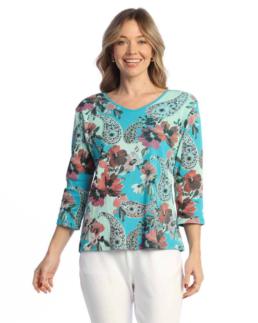 "Valencia" Abstract Print V-Neck Top - 15-1868-TL
